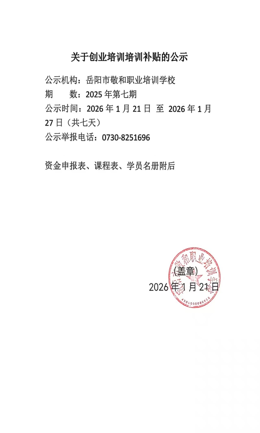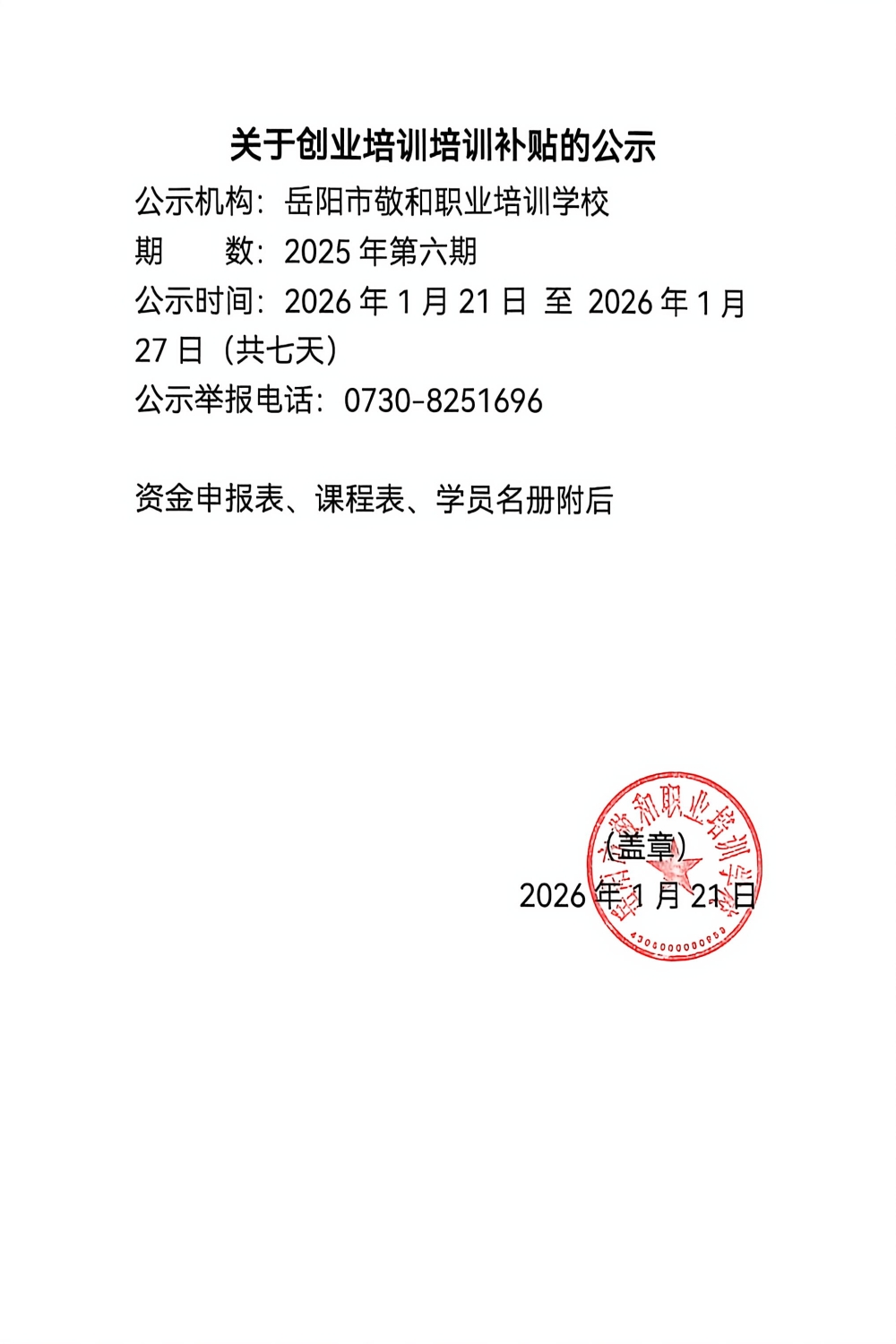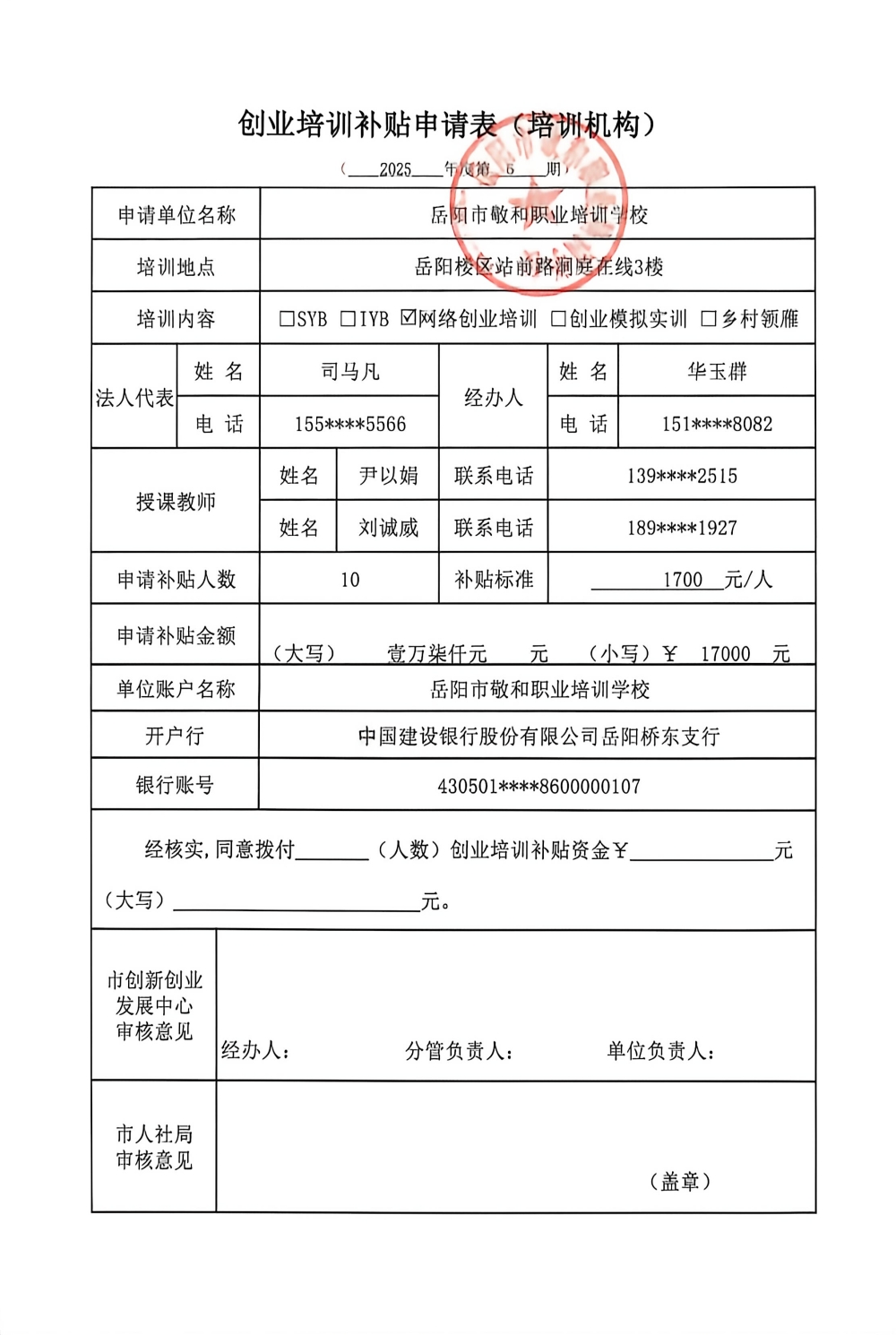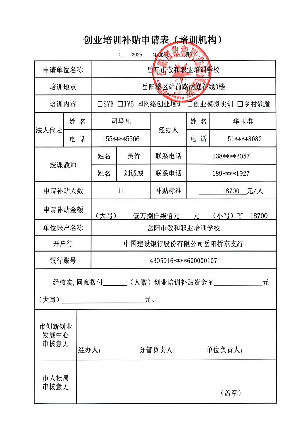 岳阳市敬职业培训学校2025年第六、七期网络创业培训资金申请表、课程表、学员名册