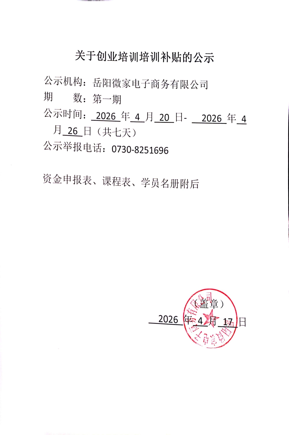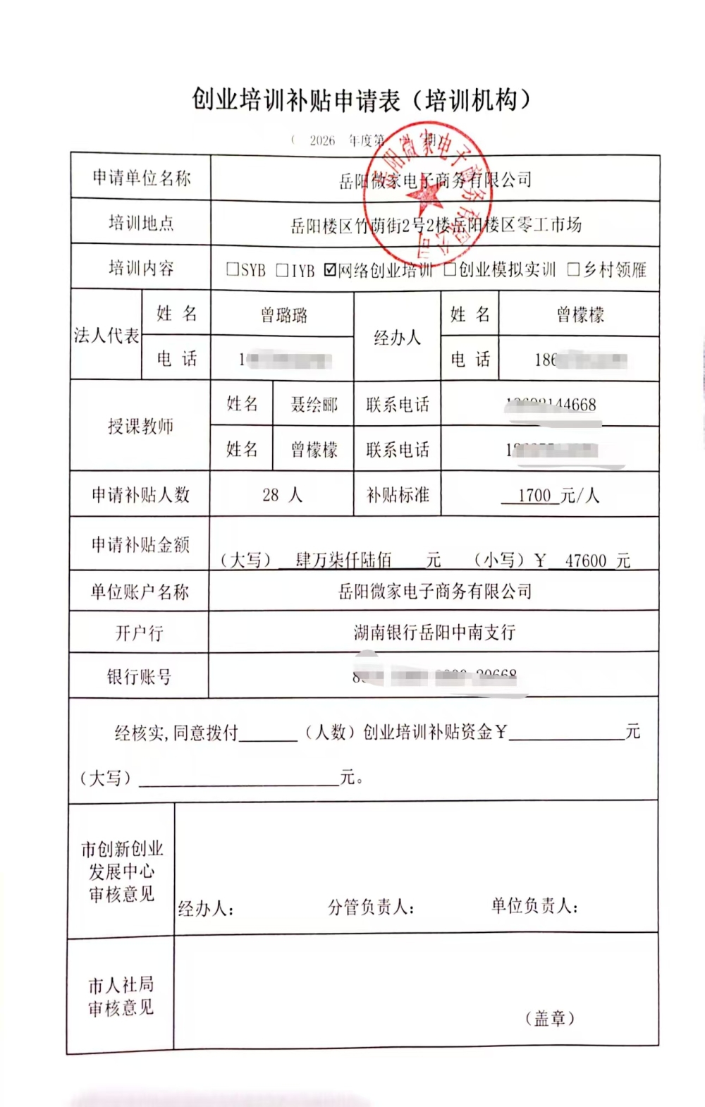 岳阳微家电子商务有限公司2026年第一期网络创业培训资金申请表、课程表、学员名册