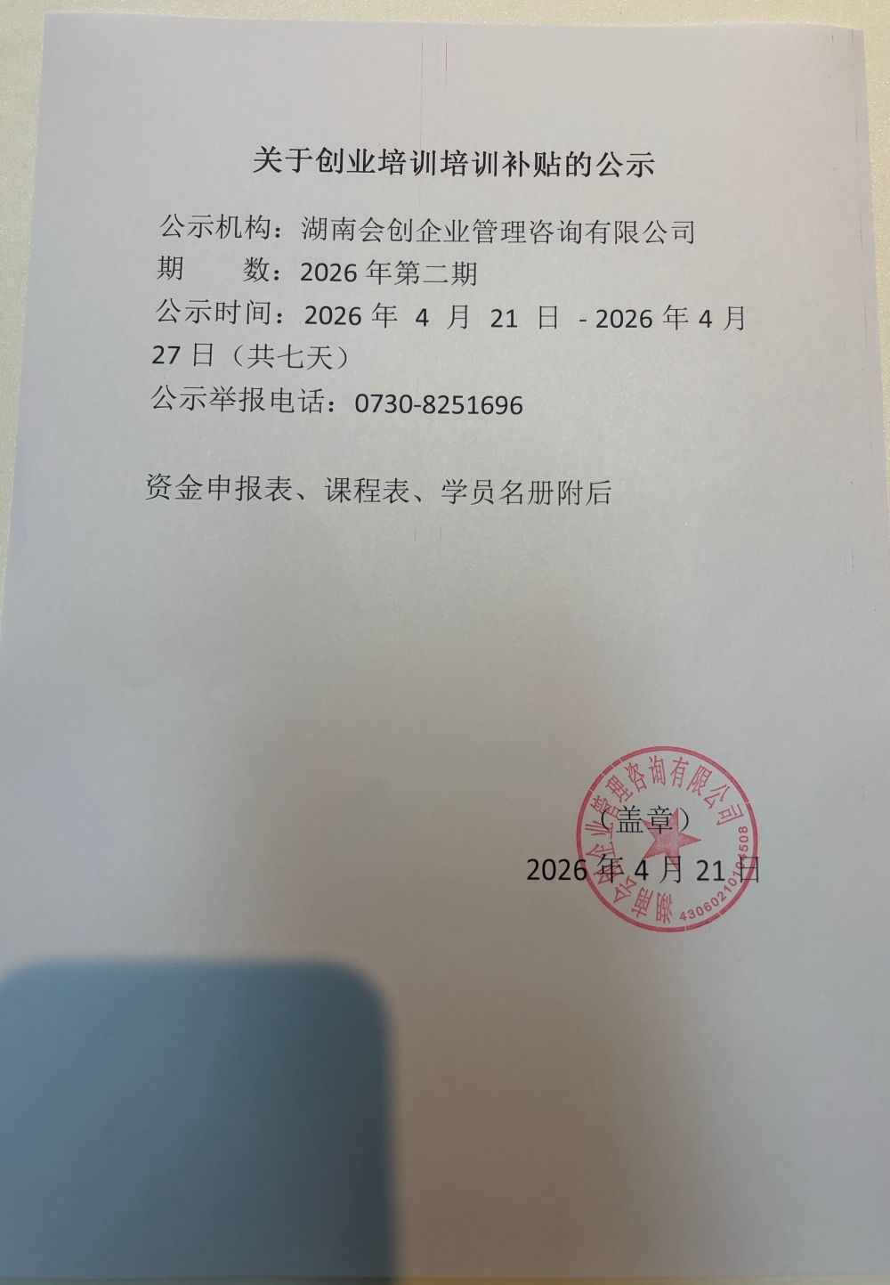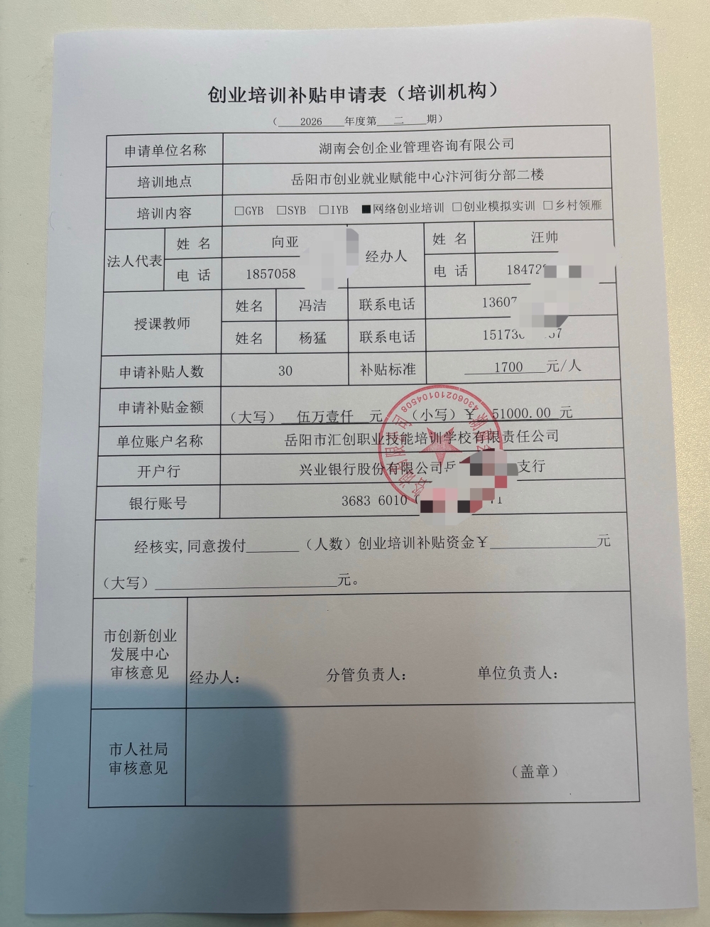 岳阳市汇创职业技能培训学校有限责任公司2026年第二期网络创业培训资金申请表、课程表、学员名册