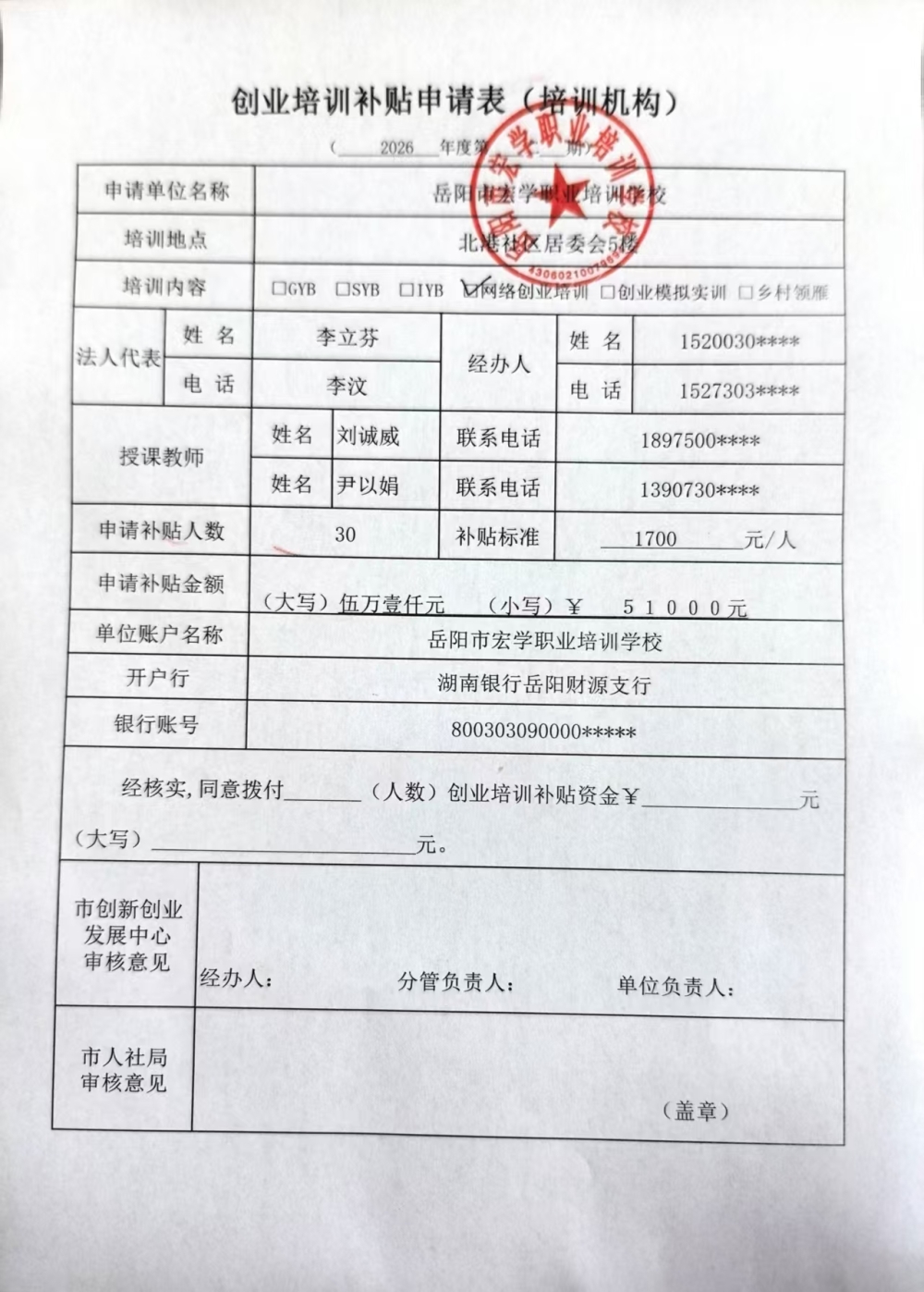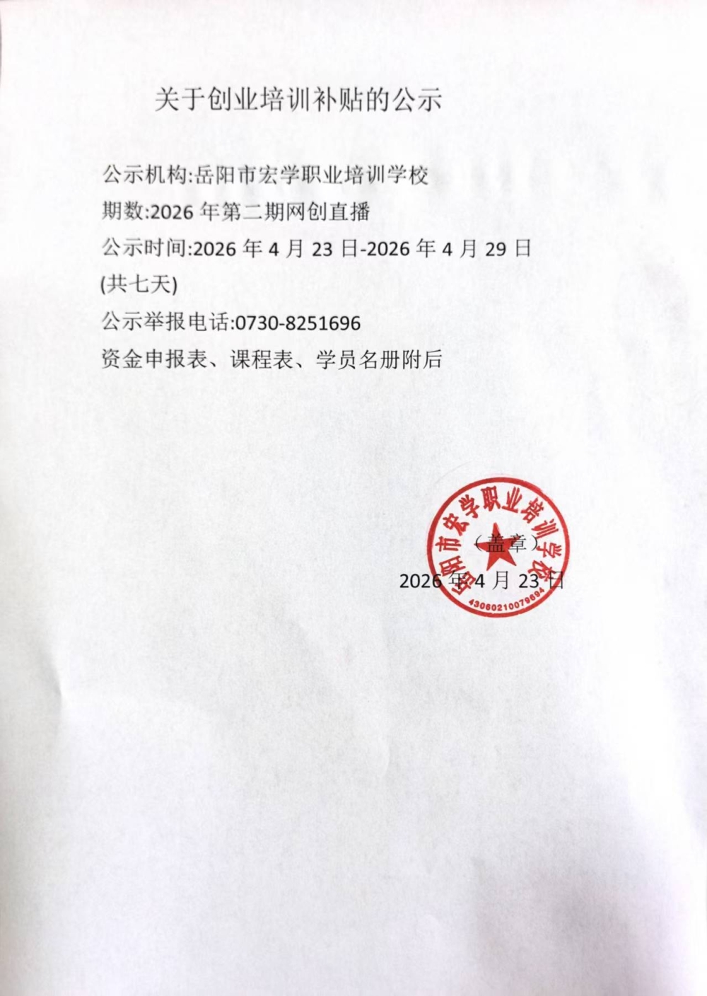 岳阳市宏学职业培训学校2026年第二期网络创业培训资金申请表、课程表、学员名册