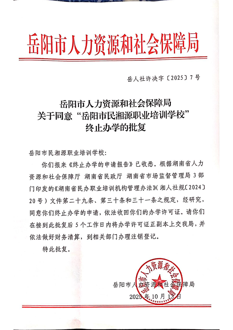 关于同意“岳阳市民湘源职业培训学校”终止办学的批复