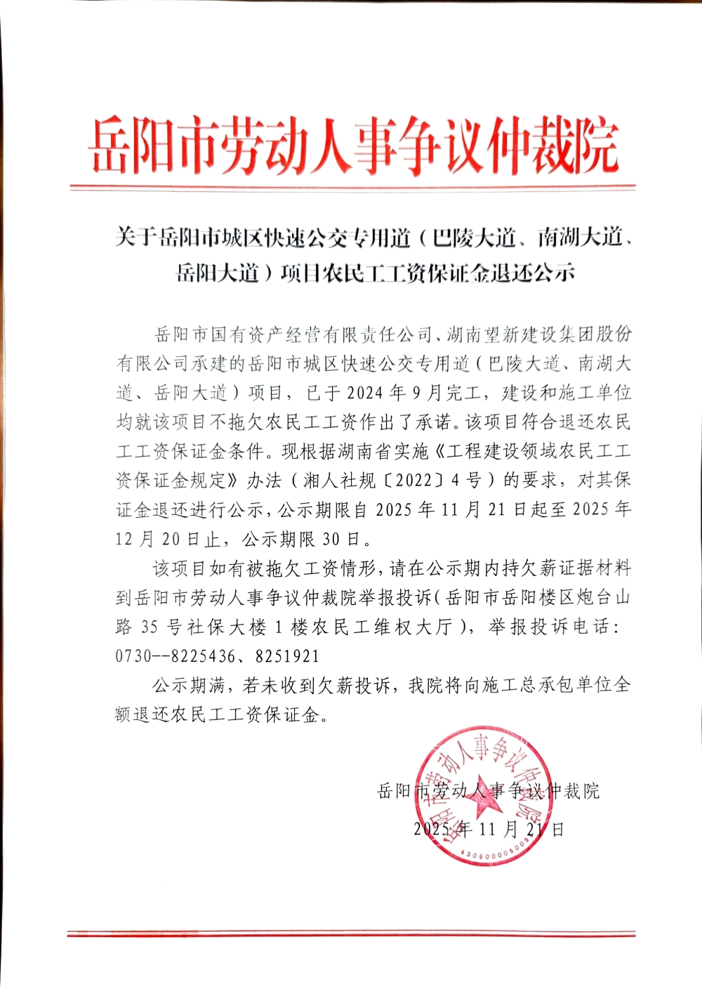 关于岳阳市城区快速公交专用道(巴陵大道、南湖大道、岳阳大道)项目农民工工资保证金退还公示