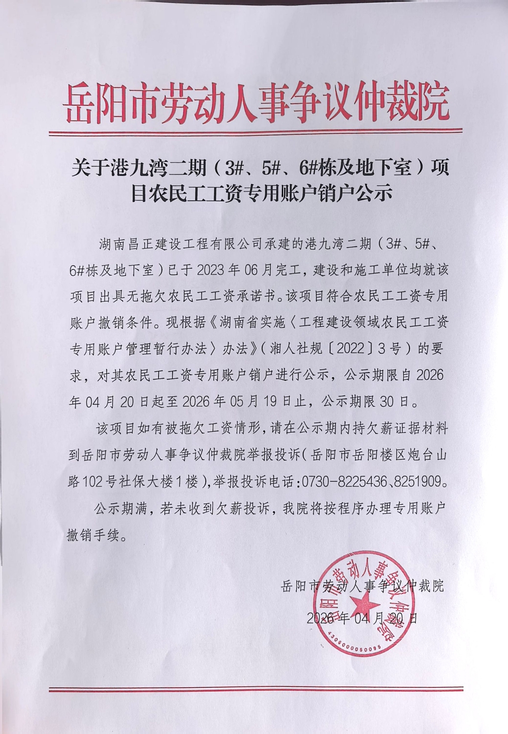 关于港九湾二期(3#、5#、6#栋及地下室)项目农民工工资专用账户销户公示