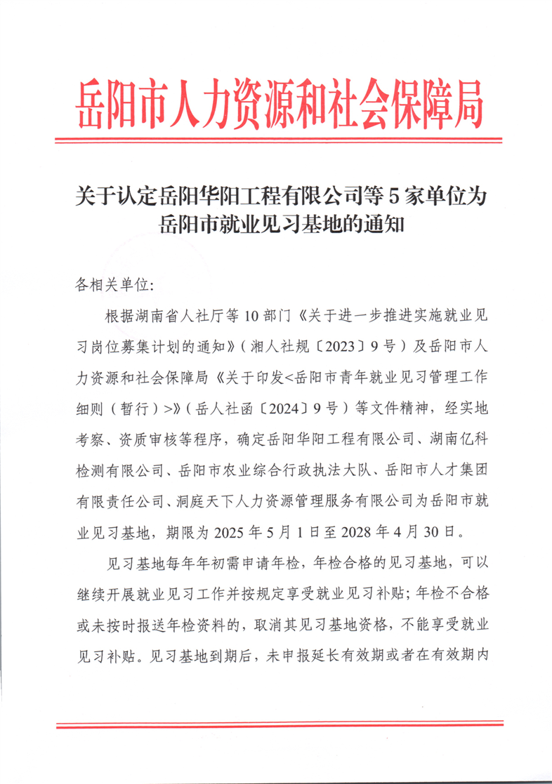 关于认定岳阳华阳工程有限公司等5家单位为岳阳市就业见习基地的通知