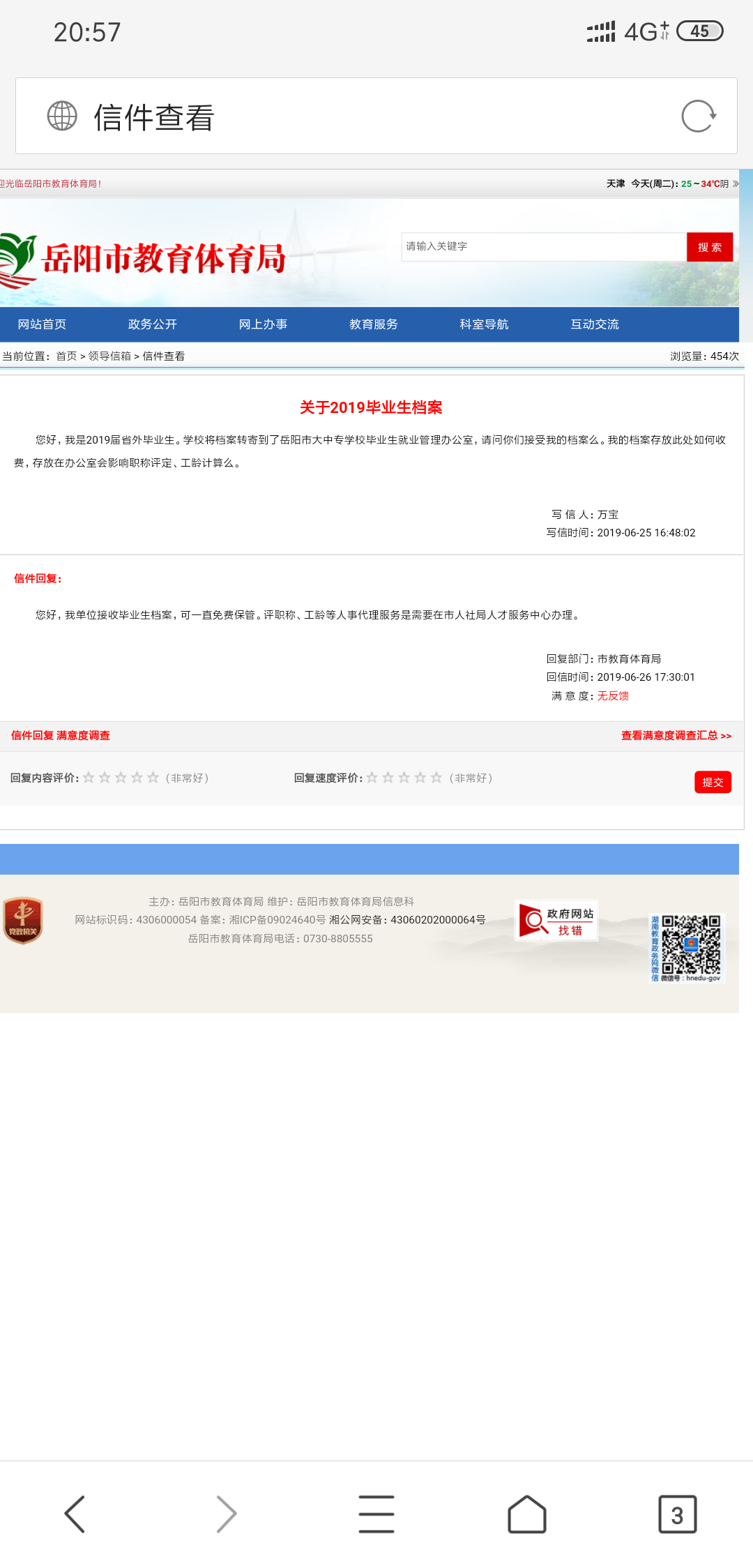 您好,岳阳市教育体育局官网说 您好,我单位接收毕业生档案,可一直免费保管。评职称、工龄等人事代理服务是需要在市人社局人才服务中心办理。